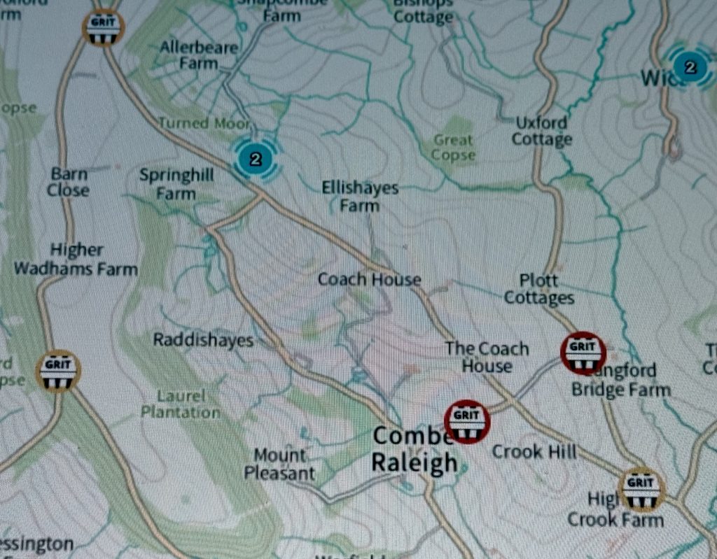 The attached screenshot is from the Devon CC Highways website (https://www.devon.gov.uk/roads-and-transport/report-a-problem/map/map_src/gritbins/). It shows the numbered grit bins in our parish: